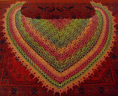 Het blokken gaf een groot verschil in uitzicht van deze sjaal:The blocking was all important for the aspect of this shawl:Le bloquage a fait toute la différence dans l'aspect du châle: